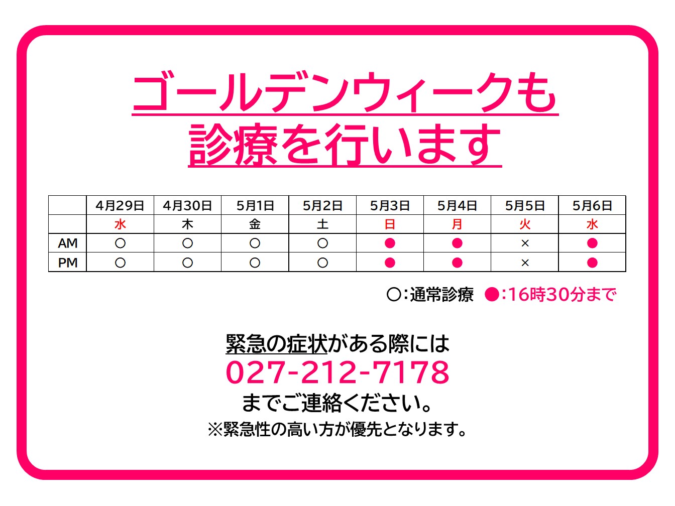 5月5日は火曜日のため休診、5月3日(日)・4日(月)・6日(水)は16時30分までの時短診療になります。